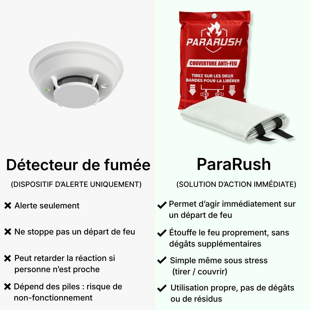 Le détecteur de fumée est indispensable : il alerte rapidement et fait désormais partie des équipements obligatoires, pour de bonnes raisons. Mais son rôle s’arrête là : il ne stoppe pas un départ de feu. La couverture ParaRush, elle, permet d’intervenir immédiatement et d’étouffer les flammes sans dégâts supplémentaires. Ensemble, ils offrent une protection complète et plus réactive.