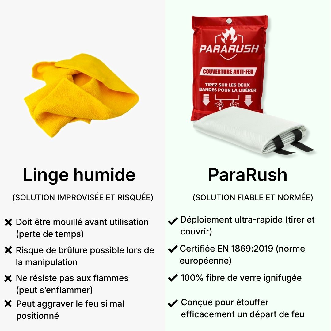 Le linge humide n’est pas conçu pour résister aux flammes, peut mal couvrir le feu et vous exposer aux brûlures. C’est pour ça que la couverture anti-feu ParaRush est largement plus sûre : elle est faite pour étouffer un départ de feu, supporte la chaleur et répond à la norme européenne EN 1869:2019.
