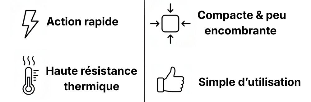 Un extincteur reste efficace, mais il peut être lourd, imposant et parfois difficile à manier sous stress. Dans une situation d'urgence retirer la goupille et viser correctement demande quelques secondes précieuses.