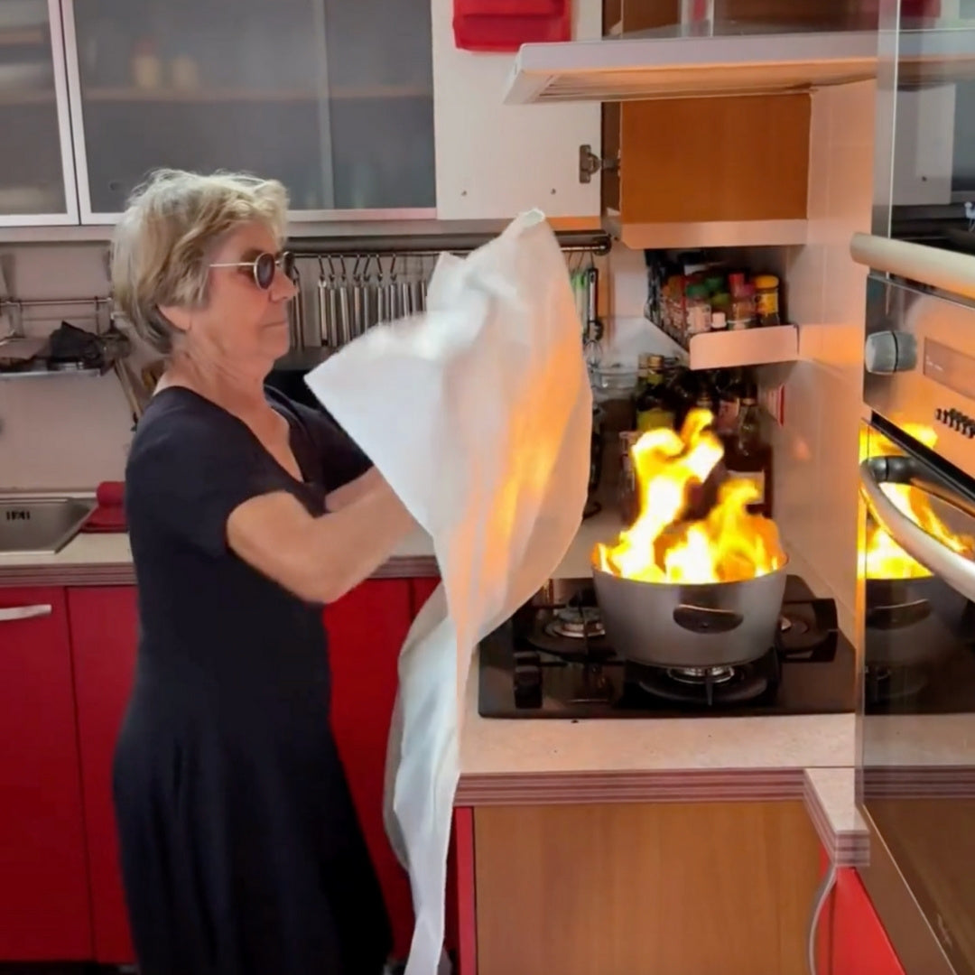 Contrairement à l’extincteur qui laisse souvent des traces de poudre difficiles à nettoyer, la couverture anti-feu agit par simple étouffement du feu, sans résidu.