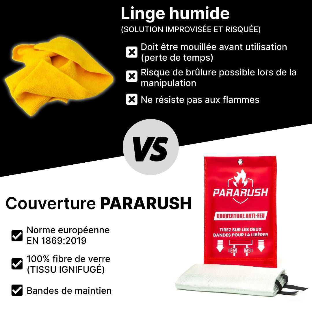 Un linge humide reste une solution improvisée et peu fiable. La couverture PARARUSH, elle, est conçue pour agir efficacement et en toute simplicité. Fabriquée en fibre de verre ignifugée et d’une dimension de 1 m × 1 m, elle offre une protection optimale.